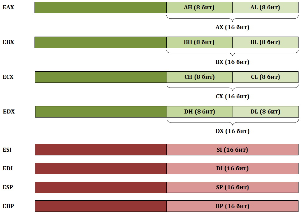 Доступ к регистрам EAX, ECX, EDX, EBX может осуществляться в 32-битовом режиме, 16-битовом - AX, BX, CX, DX, а также 8-битовом - AH и AL, BH и BL и т. д.